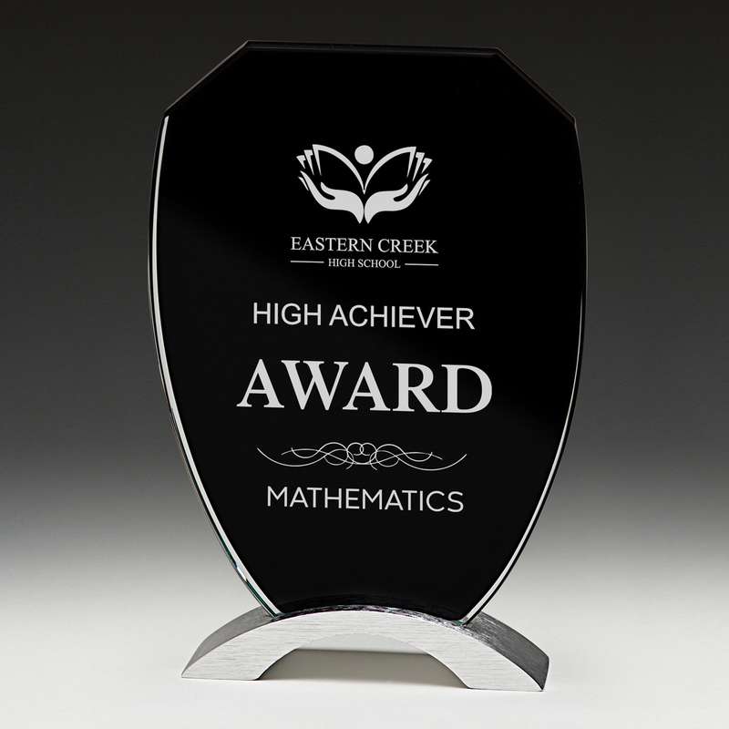Outstanding glass awards with patented black panels allow for precise engraving to your requirements. Design is elevated by the shiny metal bases. In gift boxes.