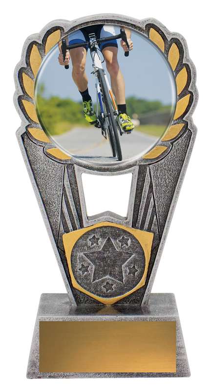 Exciting design of acrylic trophy showcases the gold theme for your sport or trophy. An affordable award with terrific space for your engraving.